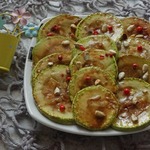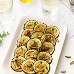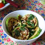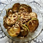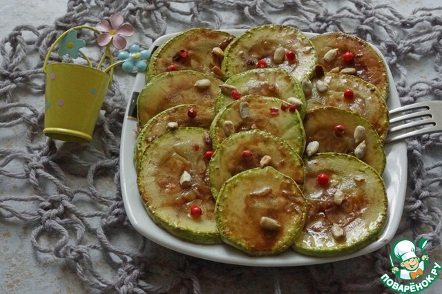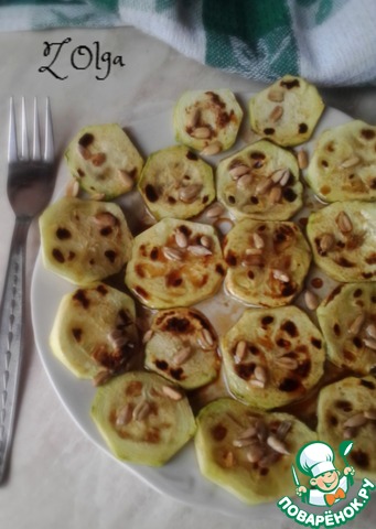 Цуккини немного остудить, залить соусом. Оставить на пару часов в холодильнике. При подаче посыпать кедровыми орешками. Для непостящихся можно также посыпать пармезаном.