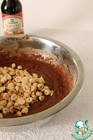 Муку с разрыхлителем и какао просеять. Орехи обжарить на сухой сковороде, очистить и крупно порубить.