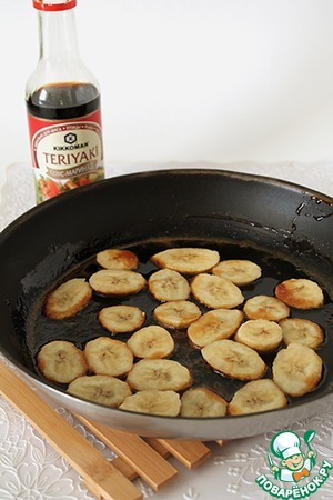 Когда сахар расплавился, вливаем соус. Возвращаем обратно на плиту, помешиваем, чтобы карамель стала однородной. Огонь минимальный. Количество соуса можете регулировать по своему вкусу. Если решите добавить меньше соуса, то добавьте в карамель немного горячей воды. Соус-маринад Терияки придаёт карамели особенный оттенок, бананы с такой карамелью можно подавать как отдельный десерт, это очень вкусно.