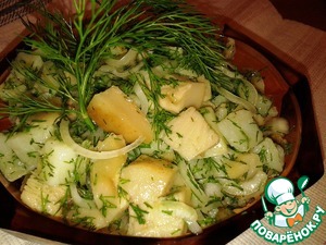 Картофель, грибы нарезаем средним кубиком, лук тонко полукольцами, укроп мелко. Солим по вкусу, добавляем нерафинированное подсолнечное масло хорошего качества.