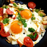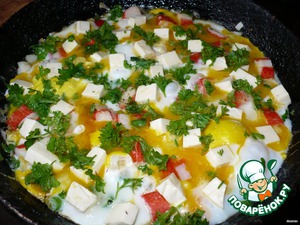 Вбиваем на сковороду яйца, всыпаем сырок, доводим до готовности, украшаем зеленью.