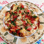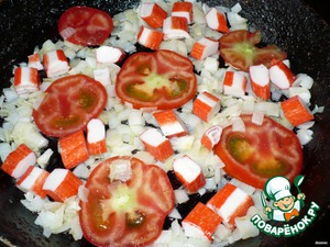 Раздвигаем лук и выкладываем помидоры и крабовые палочки.