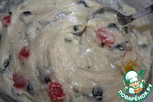 В смесь добавить цукаты и просеянную муку, смешанную с разрыхлителем теста