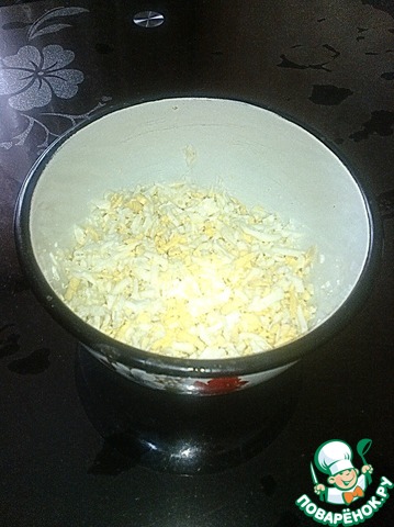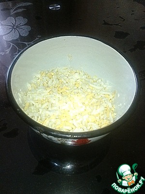 Трем яйцо на крупной терке, перемешиваем с майонезом (можно добавить мелко нарубленную зелень).