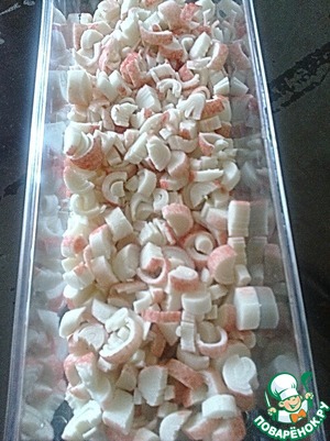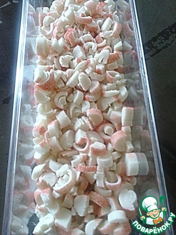 Мелко режем крабовые палочки, перемешиваем с майонезом.