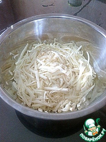Трем колбасный сыр на крупной терке, перемешиваем с майонезом.