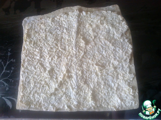 Далее раскладываем 1/2 листа лаваша. На него тонким слоем выкладываем колбасный сыр с майонезом.