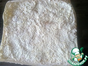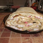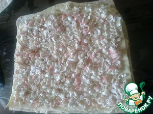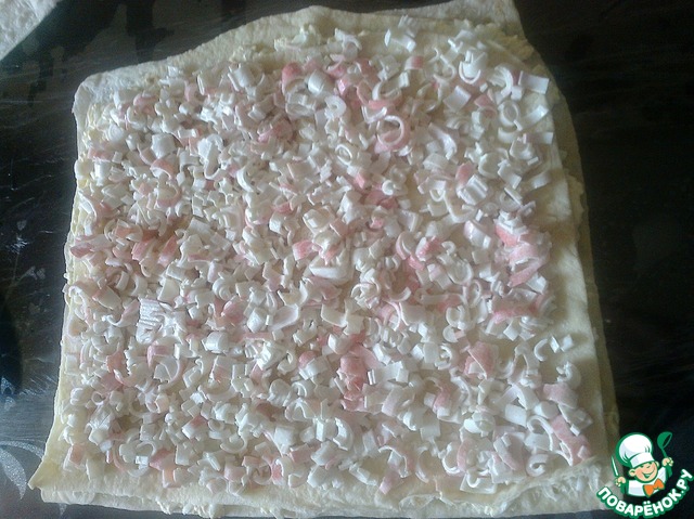 Далее раскладываем 1/2 листа лаваша. На него тонким слоем выкладываем крабовые палочки с майонезом.