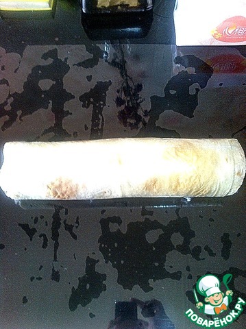 Аккуратно скатываем рулет (оставляя пищевую пленку на столе). Обматываем готовый рулет оставшимися краями пищевой пленки.