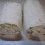 Расстилаем на столе пищевую пленку. На пленку раскладываем сложенный вдвое лист лаваша. На него тонким слоем выкладываем яйцо с майонезом.