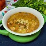 Рис промыть в холодной воде, до прозрачности воды (при таком кол-ве риса получается очень густой суп, мой супруг любит густой, если не надо густой, положите 0.5 мерного стакана риса).