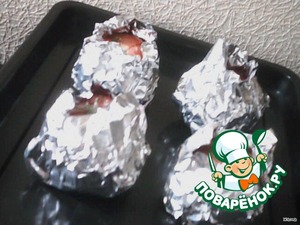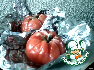Заворачиваем помидор в фольгу, оставив сверху отверстие сантиметров 4-5, чтобы помидор не запарился и не потерял форму. Всю эту красоту ставим на противень и в горячую духовку на 10-15 минут при температуре 240-250 градусов. -