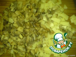 Обжаренное куриное мясо тоже порезала помельче и, добавив консервированные грибы, всё перемешала. -