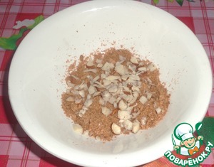 • Смешать бисквитную крошку с мелко порезанным фундуком.