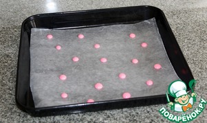 Аккуратно размазываем тесто по форме и выпекаем 10-15 мин. смотрите по вашей духовке. Очень важно не перепечь иначе не будет видно наших вишенек.