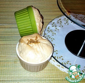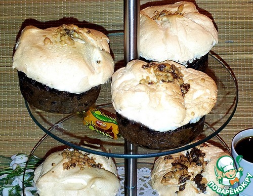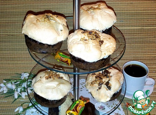 Формочки смазать маслом, разложить в них тесто, положить по ложке джема и поставить выпекаться в разогретую духовку до 180 градусов на 15 минут. Затем формочки из духовки вынуть и положить в каждую взбитый белок. Сверху посыпать измельчённые конфеты, заранее приготовленные и выпекать до золотистого цвета белка. Узким и острым ножом отделить белок от формы и аккуратно вытряхнуть содержимое.