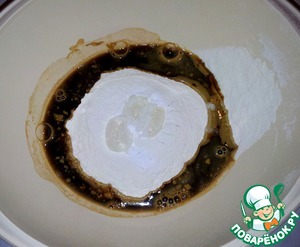 Муку просеять в миску и добавить сахар. Заварить крепкий кофе по своему вкусу и охлаждённый вылить в миску с мукой. Всыпать соду и налить лимонную кислоту. Хорошо перемешать.