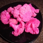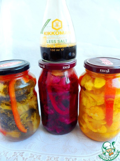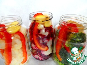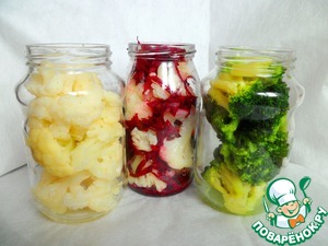 Отварить брокколи в подсоленной воде 2 минуты. Натереть кусочек свеклы на крупной терке. Разложить в 3 пол-литровые банки капусту: в одну-цветную капусту, во вторую-цветную капусту со свеклой, в третью- брокколи.