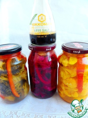 Закрыть сверху крышками, остудить и поставить в холодильник мариноваться на 6-7 дней. Через 7 дней достаем, выкладываем капусту на тарелку разноцветными полосками и угощаемся.