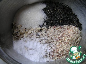 Смешать овсяные хлопья (лучше немного измельчить), кунжут, орехи, соль и разрыхлитель.