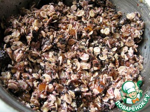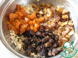 Добавить мелнко нарезанные финики, курагу и чернослив, перемешать.