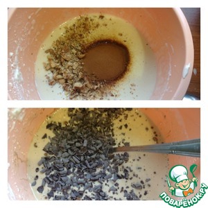 В третью часть добавить кофе и орехи, не очень мелко покрошенные, перемешать, затем добавить шоколадную стружку и аккуратно еще раз перемешать