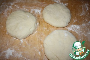 • Отделяем три куска, формируем из них большие круглые булочки. Раскатываем каждый кусок в круг.