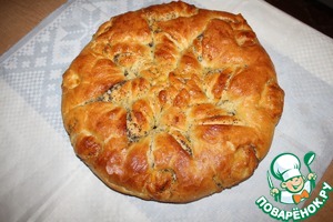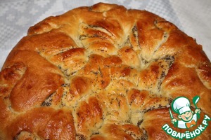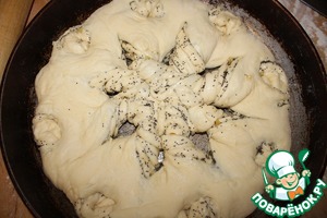 • Берем каждый получившийся треугольник, скручиваем его жгутом в одном направлении и укладываем обратно на сковороду. Получившийся "цветок" смазываем взбитым яйцом и отправляем в разогретую до 220 градусов духовку минут на 40 (до румяной золотистой корочки).