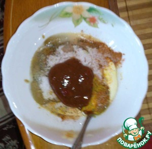 Подготовим маринад для куриного филе: 2 ложки майонеза+2 ложки горчицы+сацибели+сол ь+черный перец+травки и пряности. Все тщательно перемешать.
