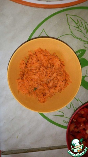 • После прожарки, (я не указываю время, потому что у всех разные плиты. Но думаю, что про зажарку все все знают) выкладываем содержимое сковороды в чашу мультиварки (у меня 5-литровая). Теперь заливаем 2-3 помидора кипятком и через пару минут в ледяную воду. Ошкуриваем, режем на мелкие куски и тоже в мультиварку.