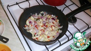 • Первая закладка: лук, мелко порезанный чеснок и острый перец чили. Жарим до готовности