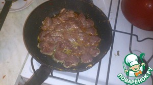 Теперь печенка. Выложил на ту же сковороду (не мою, только чуть добавляю масла). Перчу, солю. Пару раз переворачиваю.