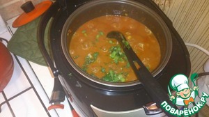 Минут за десять до готовности добавляем зелень и снова перемешиваем. (Я еще добавил 2 листочка лаврушки)