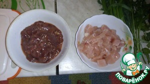 Подготавливаем курицу и печень. Печень тщательно промыть и порезать. Филе порезать на кусочки по желанию (но не крупные)