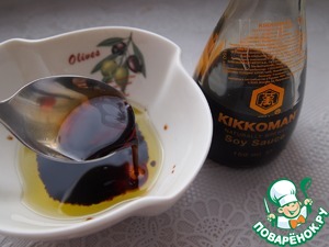 Приготовить заправку. Смешать оливковое масло с бальзамическим соусом и соевым соусом.