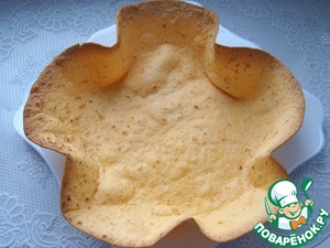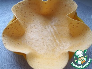Затем поместить лепешку в форму с бортиками, чтобы получилась форма типа корзинки.