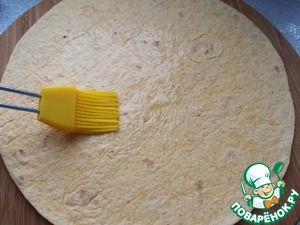 Постную лепешку смазать оливковым маслом с двух сторон (лепешку можно заменить на лаваш, обрезав его по нужной форме).
