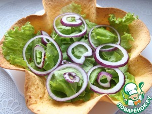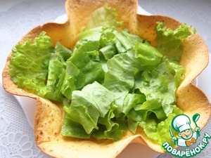 Зеленые листья салата помыт, обсушить и порвать на кусочки.