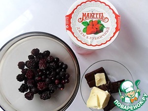 • Пока остывает бисквит, я поставила размораживать ягоды. Сейчас, конечно, не лето, но здесь лучше подойдут свежие ягоды - они не дадут сок при разморозке. В оригинале была голубика, я заменила на свою любимую ежевику (90 г) и смородину (30 г).