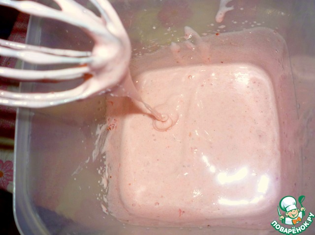 • Оставляем будущий мусс остывать до комнатной температуры. А дальше остышую массу взбиваем миксером на максимальной скорости в течение нескольких минут, пока она не увеличится в размере в 3-4 раза. Цвет станет нежно розовым.