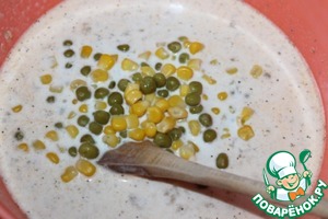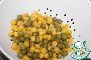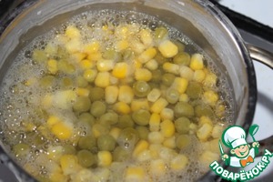 Заливаем горошек и кукурузу небольшим количеством воды, доводим до кипения и кипятим ровно минуту.
