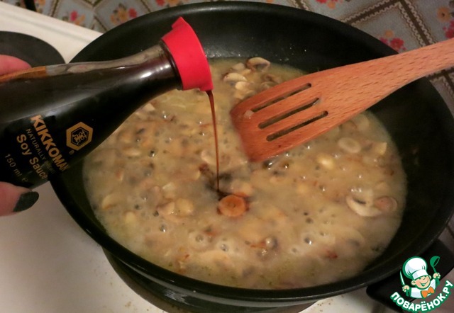 Добавляем примерно 4 ст. ложки соевого соуса (количество зависит от вашего вкуса и вида соуса), даем закипеть и снимаем с огня.