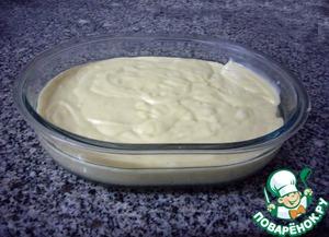 Вылить тесто в смазанную маслом форму, лучше, конечно, разъемную, но у меня вот такая, стеклянная.