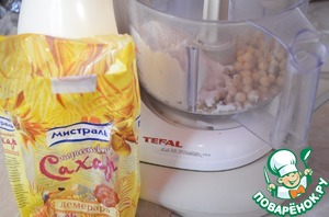 в чашу комбайна установить нож для рубки, поместить нут, муку, кунжут и сахар, растительное масло, добавить воду. Хорошо прокрутить до образования однородного теста.