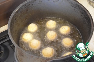 В казан налить растительное масло, масло нагреть и обжарить пончики до золотистого цвета.