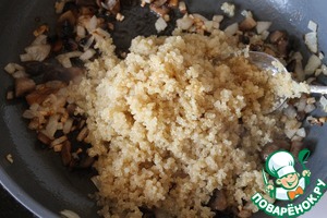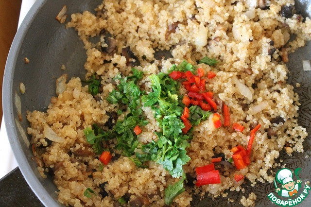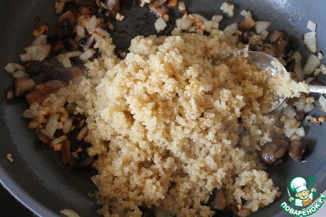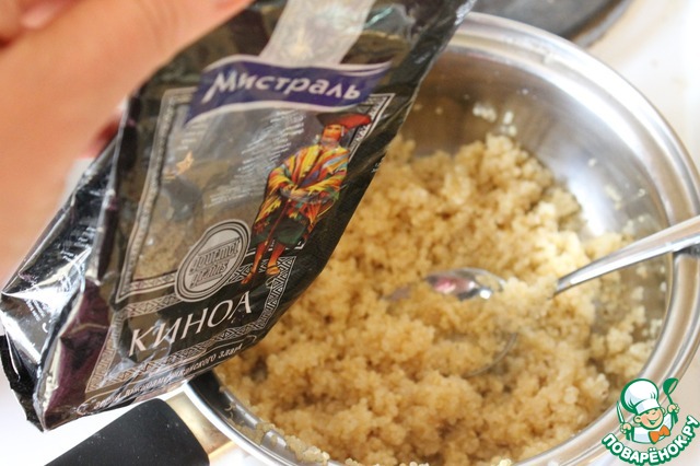 Киноа отварить до готовности в пропорции 1:2. Довести до кипения, убавить огонь и с закрытой крышкой 20 минут. До полного спитывания жидкости
