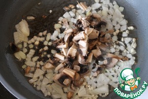 Лук и чеснок обжарить на оливковом масле, добавить шампиньоны, обжарить