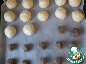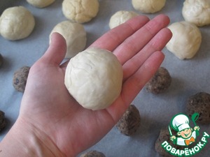 Тесто также разделите на 16 равных частей и из каждой скатайте аккуратный шарик. Легче всего это сделать влажными руками. -