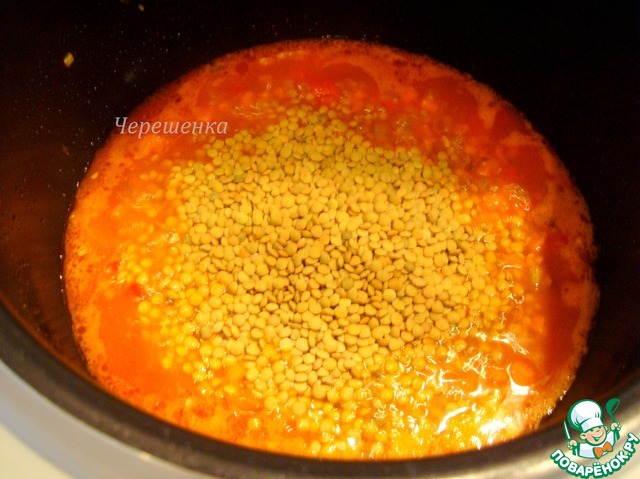 Всыпать чечевицу, перемешать, добавить еще 800 мл воды и варить в соответствии с инструкцией на упаковке.