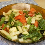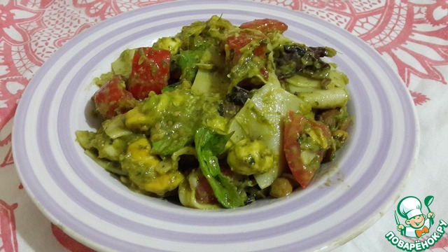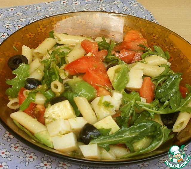 Отправляем это все в наши остывшие макароны (пасту), добавляем маслины, рваную рукколу (не режем, иначе она станет горькой!!!) и заправляем заранее приготовленным соусом "Песто" (или купленным у кого есть).